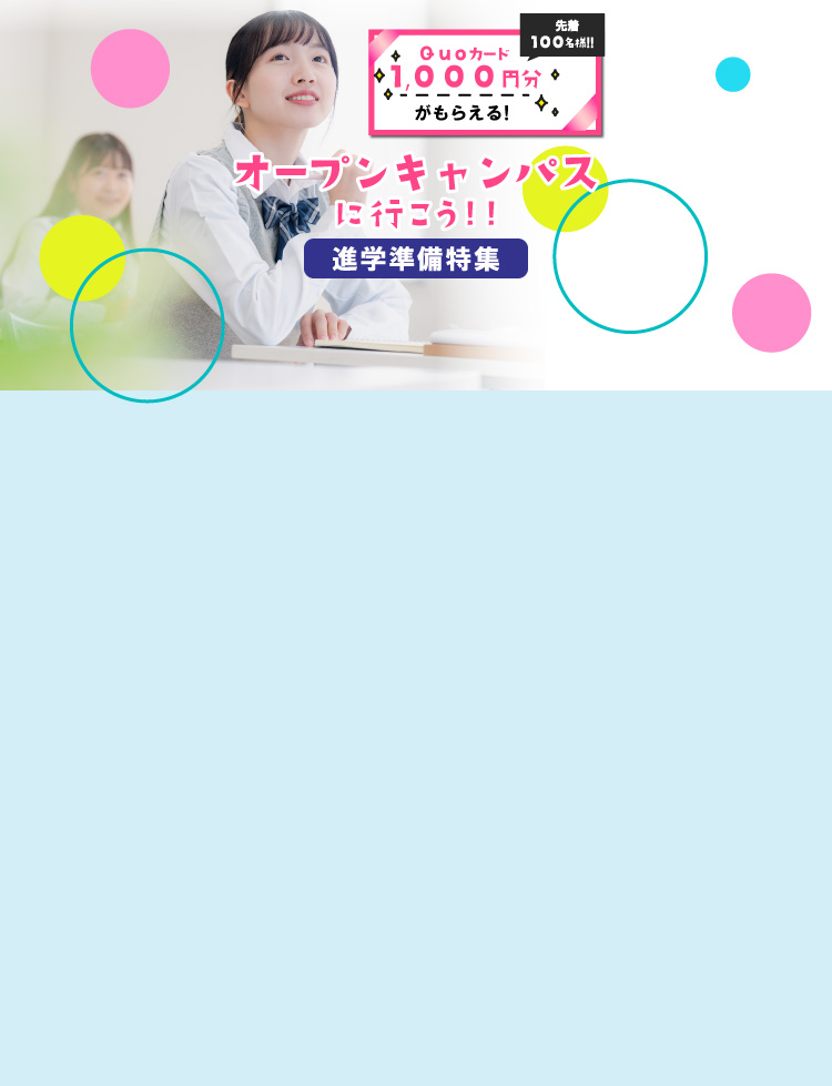 京都府・大阪府・兵庫県・奈良県の大学・短大・専門学校のオープンキャンパス特集。進路を考えるすべての高校生へ!高校1~3年生、保護者の方も歓迎!オープンキャンパスで未来を見つけよう