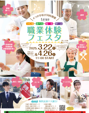 「食」へのニーズが高まる近年、大注目の分野です!また、調理・製菓・栄養分野のイベントは、体験内容が多彩で楽しいものが多いのでぜひお気軽にご参加ください♪
