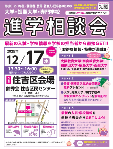 2025年12月17日(水)大学・短期大学・専門学校合同 進学相談会 【住吉区会場】in 錦秀会 住吉区民センター