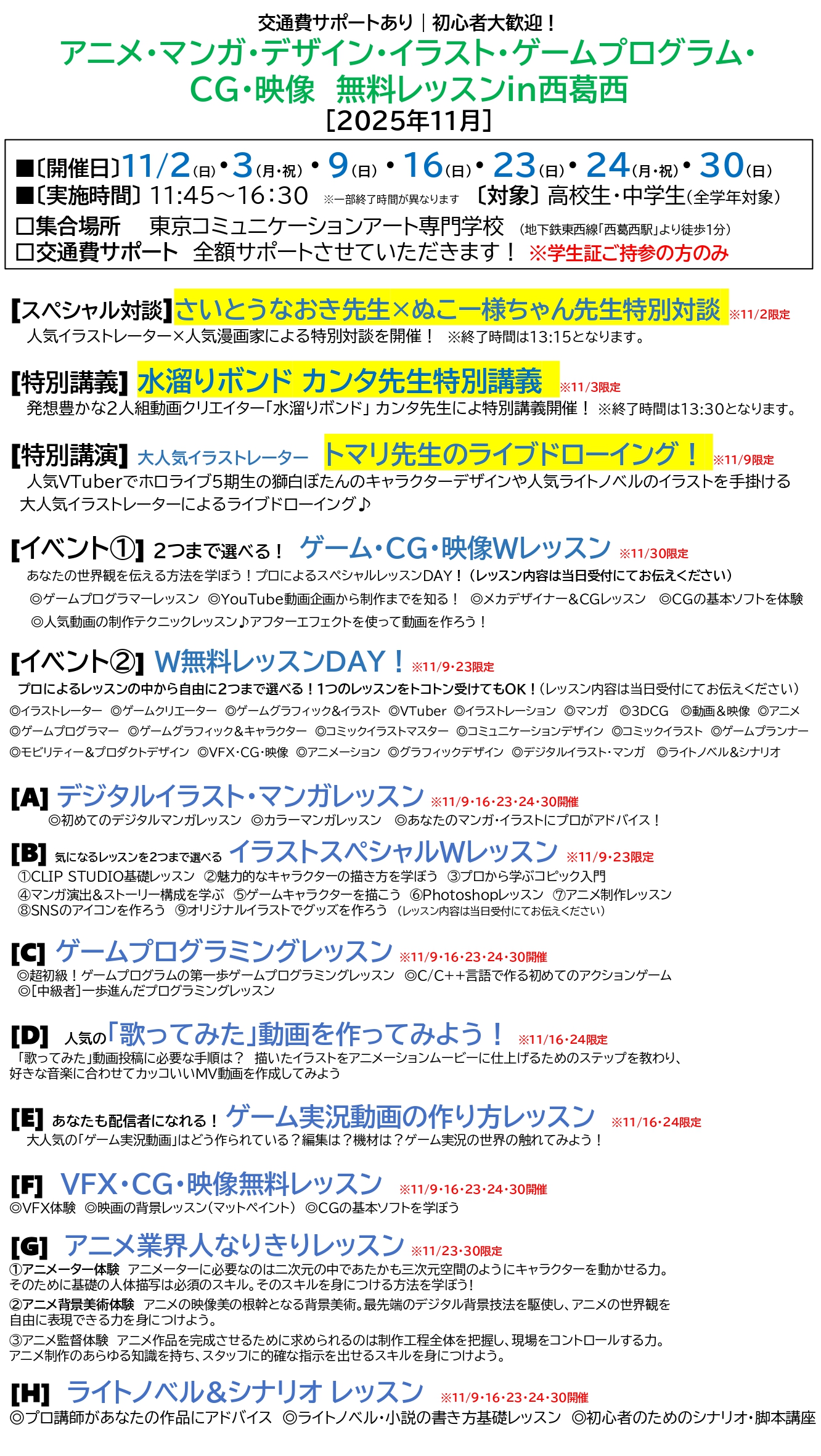 【交通費補助/参加費無料】中学・高校生対象●アニメ・マンガ・デザイン・イラスト・ゲームプログラム・CG・映像 無料レッスンin西葛西(11月版)