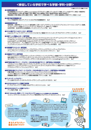 チラシPDFの2枚目に参加校で学べる学部・学科・分野の一部を掲載しています。