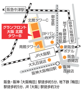 - JR「大阪」駅より徒歩約3分 各線「梅田」駅より徒歩約5分