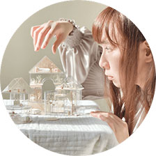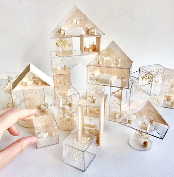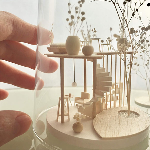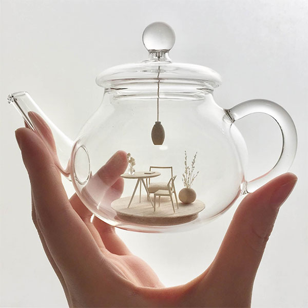 私は添景(てんけい)と呼ばれる演出目的の人・車・家具などの家具模型を得意としていて、特に家具が好きでした。家具を置くとその場所が問答無用で住空間になることに気づき、色々な空間構成を試しながら制作しています。例えば、ティーポットが持っているイメージ(溜める、注ぐ、保温など)と、家具のある空間を組み合わせたら、人は何を見出すかな?どんなことを考えるかな?とか。