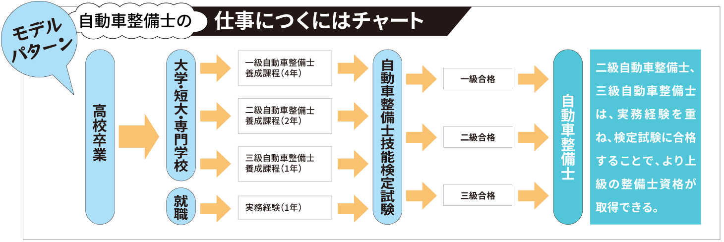 自動車整備士は、自動車の専門的な技術と知識を持ち、点検・整備を行う職業です。新車の納入、車検時の自動車の点検・整備、モータースポーツのメカニックに至るまで、仕事内容は多岐にわたります。点検・整備は自動車ユーザーに快適な運転を提供し、車の安全性を向上させることにつながります。最近は地球環境に配慮したハイブリッドカーや燃料電池自動車、電気自動車などが登場し、整備に必要な専門知識が増え、期待が寄せられています。
