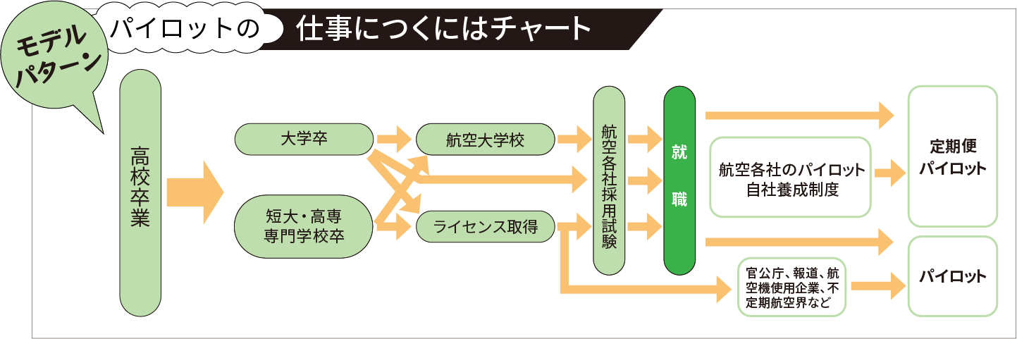 パイロットになるには、国家資格「事業用操縦士」の取得が必要なほか、無線に関する資格や国際線に必要な英語資格など高い技能が求められます。大学や短期大学・専門学校で所定の単位を修得後、航空大学校に入学して学び航空会社へ入社する方法、航空操縦やパイロット養成のコースがある大学・専門学校に入学して資格を取得してから航空会社へ入社する方法、または大学卒業後に航空会社に入社し自社養成パイロットとなる道があります。