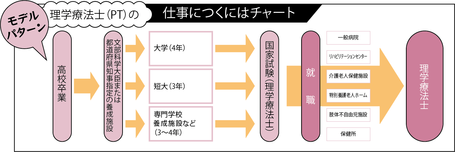 理学療法士になるには理学療法士国家試験に合格する必要があります。受験資格は、理学療法士の養成課程のある大学(4年)、短期大学(3年)、専門学校(3~4年)などを卒業すると得られます。