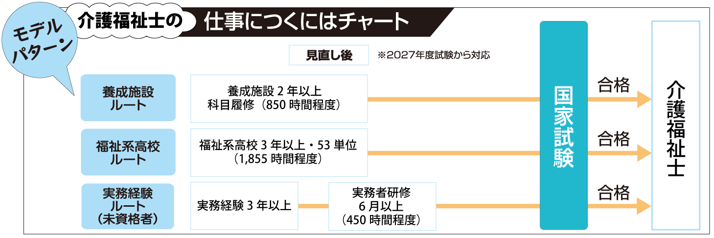 介護福祉士になるには、複数の方法がありますが、厚生労働省指定の介護福祉士養成施設(大学・短期大学・専門学校)の場合、2026年度までは国家試験を受験しなくても「卒業後5年間期限付き」の介護福祉士資格を取得できます。しかし、介護福祉士の質を向上する目的で、2027年度以降の卒業生から国家試験の受験を義務づける方針が進んでいます。無資格でも介護の仕事はできますが、介護福祉士の資格を所有することで業務の幅はもちろん、待遇にも差がつきます。