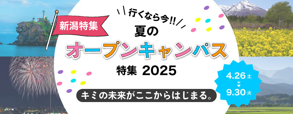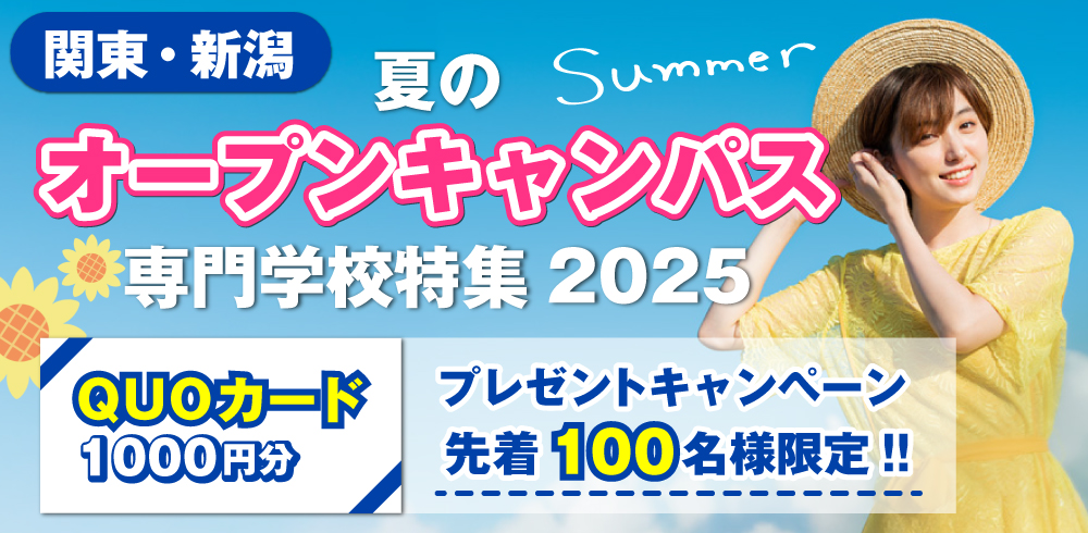 | 応募方法 | 【関東・新潟】夏のオープンキャンパス専門学校特集2025ページからオープンキャンパスにお申込みいただくと、自動的に応募が完了します。 ※オープンキャンパスとは「学校説明会」、「体験入学」等すべてのイベントを含みます。 |