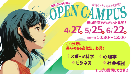 オープンキャンパス検索 学校の種類 大学 短期大学 専門学校 その他教育機関 エリア・開催地域 選択 エリアを選択してください エリアを選択する 系統・分野 選択 経営学・流通学 系統・分野を選択する 日程を指定する ~ 実施形式 来場形式 オンライン形式 事前申し込み 事前予約必須 不要 72件の検索結果がでました。 日付が早い順 日付が遅い順 徳島県 徳島文理大学短期大学部 トクシマブンリダイガクタンキダイガクブ 学校の詳細を見る 2024 オープンキャンパス 5科2専攻11コースの学びが体験できるオープンキャンパスを開催します。オープンキャンパスに参加して、希望学科を自分の目で確認しよう! ☆お車でお越しの方は南門から入っていただくと駐車場がございます。保護者の方のご参加もお待ちしております。 ※四国4県から無料送迎バスを運行します(要予約)その他交通費補助制度もあります。 詳しくは本学受験生応援サイトをご覧ください(https://jyuken.bunri-u.ac.jp/events/tokushima-oc/) 大分県 別府大学 ベップダイガク 学校の詳細を見る 模擬授業を通して学科での学びを体験してみてください。 各学科の模擬授業や入試相談コーナー、保護者対象説明会、学生寮見学など盛りだくさんの企画を準備しています。本学のキャンパスライフを体験できる機会となりますので、ぜひご参加ください。高校生のみなさんのご来学をお待ちしています。 千葉県 江戸川大学 エドガワダイガク 学校の詳細を見る オープンキャンパス、入試相談会、個別相談会などの入試イベントを実施中! 3/21(土) 宮城県 仙台青葉学院短期大学 センダイセイヨウガクインタンキダイガク 学校の詳細を見る OPEN CUMPUS 2025 本学のオープンキャンパスは、学科ごとに開催日程が異なります。 本学キャンパスが会場です。学科紹介や入試説明、体験授業などのプログラムを用意しています。 また、在学生とのフリートーク、入試・学費の個別相談ブースも用意していますので、大学生活のことや、普段の授業のこと、受験勉強のコツなど…疑問に思っていることや不安なことを解消しましょう! 完全予約制ですので、必ず事前にご予約をお願いします。 栃木県 作新学院大学 サクシンガクインダイガク 学校の詳細を見る オープンキャンパスへ行こう! 作新学院大学のオープンキャンパスに参加して、大学の雰囲気や魅力を体験してください! 1 … 8 9 10 11 12 … 15