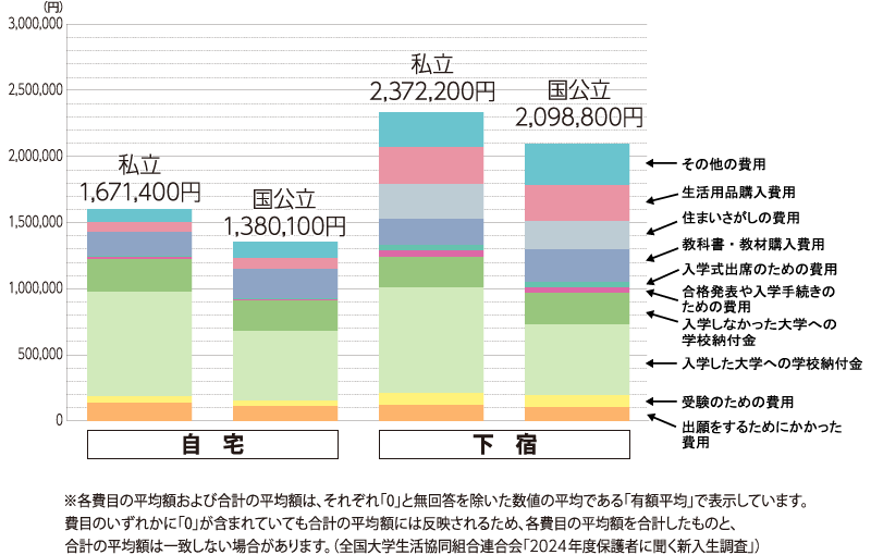 全国大学生活協同組合連合会がまとめた「2024年度保護者に聞く新入生調査」によりますと、受験から入学前までには、100万~200万円以上というまとまったお金が必要になります。国立大学進学か私立大学進学かで、学校納付金に大きな違いが出てきます。また自宅通学か自宅外通学かによって、住まい探しの費用などにも違いが出てきます。