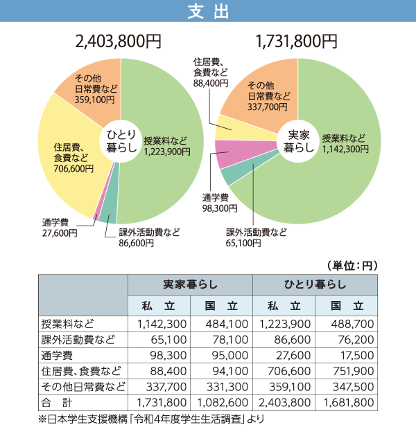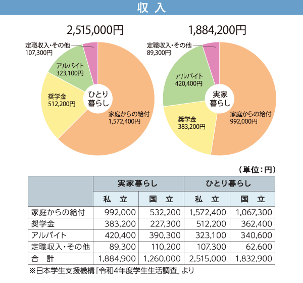 令和6年3月に独立行政法人日本学生支援機構より発表された「令和4年度 学生生活調査結果」によりますと、私立大学にひとり暮らしをして通う学生と、実家暮らしをして通う学生の年間の収入と支出は、下記円グラフの値となっています。