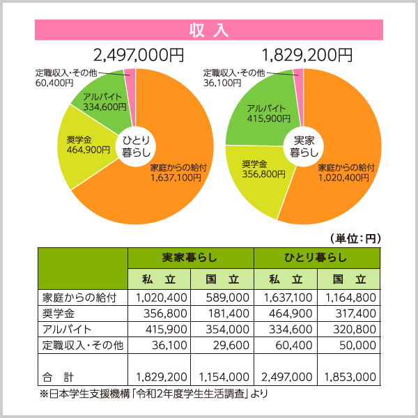 令和6年3月に独立行政法人日本学生支援機構より発表された「令和4年度 学生生活調査結果」によりますと、私立大学にひとり暮らしをして通う学生と、実家暮らしをして通う学生の年間の収入と支出は、下記円グラフの値となっています。