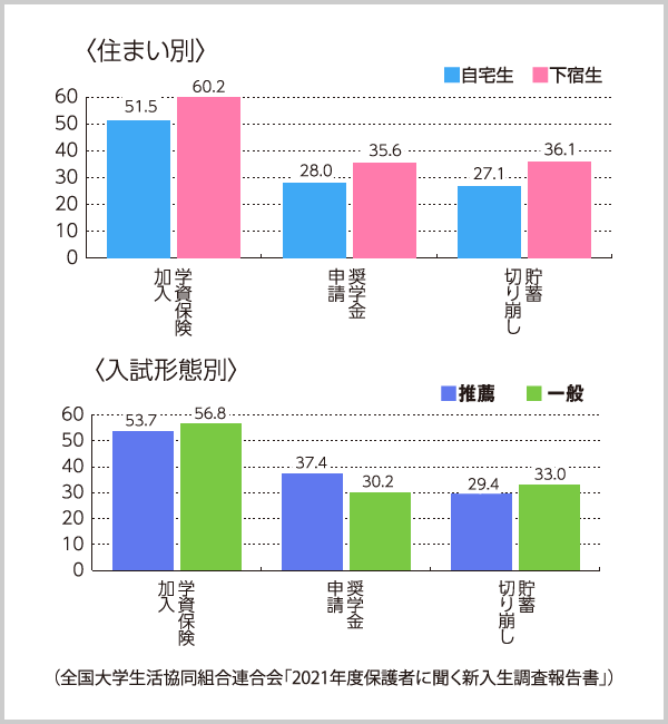 全国大学生活協同組合連合会がまとめた「2024年度保護者に聞く新入生調査」によりますと、受験から入学前までには、100万~200万円以上というまとまったお金が必要になります。国立大学進学か私立大学進学かで、学校納付金に大きな違いが出てきます。また自宅通学か自宅外通学かによって、住まい探しの費用などにも違いが出てきます。