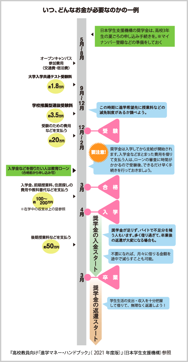 教育ローンなどを利用する場合は、合格発表の前から申請手続きを進めておきましょう。入学直前になって資金不足に気づいて、あわてて申請しても、審査に時間がかかり間に合わなくなる場合があります。申請は、受験後のタイミングでしましょう。