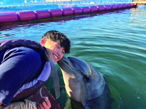 潜水士の資格取得を目指し、国家資格対策の授業も行います。「ドルフィントレーニング」の授業では、調餌・給餌・トレーニングを体験するなど、現場で必要な知識や技術を学びます。