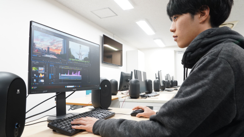 誰でも簡単に動画がつくれる時代だからこそ、オリジナリティのある質の高い動画をつくることができるオンリーワンなクリエイターが求められています。このコースでは、プロ仕様の編集ソフトや撮影機材を使用して、動画制作スキルを習得するのはもちろん、撮影やデザイン技術も学び、即戦力として活躍できる動画クリエイターをめざします。