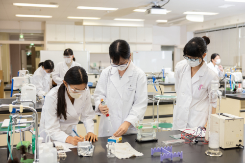 管理栄養士国家試験受験資格取得を前提に、本学独自の科目を設け、教育内容の充実を図っています。管理栄養士として活躍する場を考慮して、医療栄養系、福祉栄養系、公衆栄養・国際栄養系、スポーツ栄養系、フードサービスマネジメント系、5つの分野を設けています。分野ごとに講義と実習科目を体系的に組み合わせた特徴的なカリキュラムを編成し、より専門性の高い学習を可能にしています。管理栄養士としての実践力を高めるために、演習や実験・実習内容を工夫し、自ら考え、体験しながら学習を深めます。