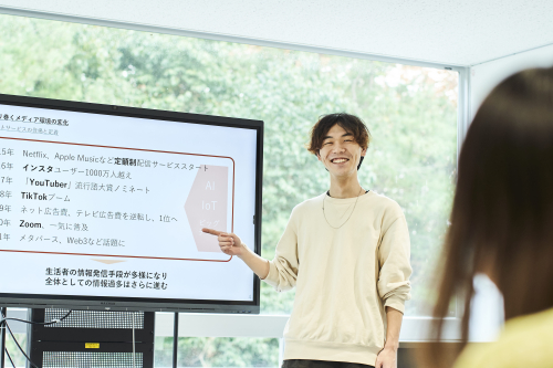 メディアやコンテンツの企画開発を学びます。課題を発見するためのさまざまなリサーチ技法、プロジェクト運営のためのチームマネジメントやプレゼンテーションに取り組みながら、イベントや広告などの企画を実際に社会へ発信し、世の中の評価をもとにブラッシュアップしていきます。積極的に学外へ出て現場をリサーチすることや、企業や行政、地域コミュニティなど多様な人びとと連携することを重視します。