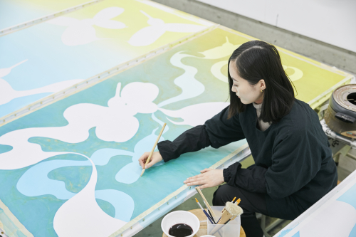 布に色をつける「染め」と、糸をつむぐ「織り」の技法によって生み出されるテキスタイル。日本有数の充実した設備を使って、シルクスクリーン、ろうけつ染め、型染め、つづれ織り、フェルト、縫いなどの幅広い技術を習得することができます。また、伝統文化も盛んな京都という立地を生かして、友禅や西陣織などの伝統技法を学ぶ機会や染織関係企業との連携などを通じ、社会との接点をもって力を伸ばせる機会を豊富に用意しています。