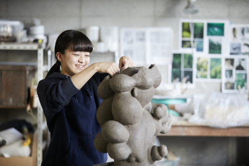 手びねりやろくろなどの成形技法をじめ、釉薬の扱い方、焼成方法や、たたら、絵付けなど、できるだけ多くの素材、技法、考え方に触れることを重視しています。器からオブジェまで多彩な作品を制作し、柔軟に発想する力を育てます。大型のガス窯から電気窯、伝統的なのぼり窯など全国でもトップレベルの充実した施設をそなえ、ほかにはない環境で作品づくりに没頭できます。指導は、現役で活躍する陶芸家たちが担当。一人ひとりの長所を伸ばす丁寧な指導と、一流の技と思想を直に感じながら、のびのびと力を伸ばすことができます。