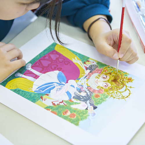木炭や色鉛筆など、さまざまな画材にふれながら、描画力・構成力・観察力を培います。その後、表現方法や色材・画材を自由に選択して、自分自身の世界を確立していきます。