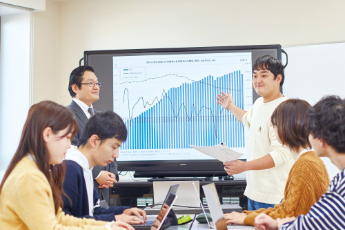 総合大学の強みである文理の垣根を越えた知識を養うクロスオーバー教育を展開しています。企業と連携した課題解決型プロジェクトでは、他学科の学生と異なる分野の専門知識を持ち寄り解決に励み、経済学の知識を新たな視点でとらえ、これからの豊かな社会づくりに貢献する実践的な力を鍛えていきます。