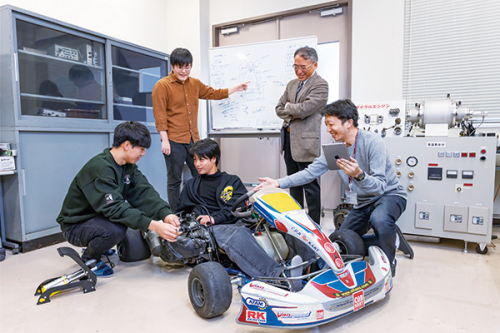 機械工学科では、あらゆる工業生産やものづくり技術の基盤となる知識の習得と人づくりを主な目標としています。今後さらなる発展が望まれるエネルギーや環境、航空宇宙やロボット等の産業分野への応用を視野に入れながら、機械力学や材料力学、熱工学や流体工学、加工や制御理論などの基礎から応用と実践までを学びます。また、それらの過程から実践的な情報処理能力や問題解決能力などを身に付け、行動力のあるエンジニアへと育成します。