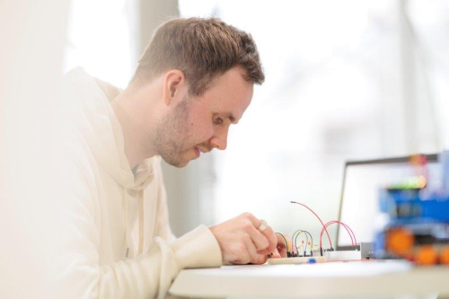 最先端の“モノづくり”を学び、社会・企業を豊かにするIoTエンジニアを目指します。デバイス制御・AI・Webなど、IoT開発に必要な3種類のプログラミング技術を身につけます。また、授業で学んだ知識をもとに自分のアイデアを作品としてカタチにする制作実習も実施。コンテスト応募を通じて発信力も身につきます。