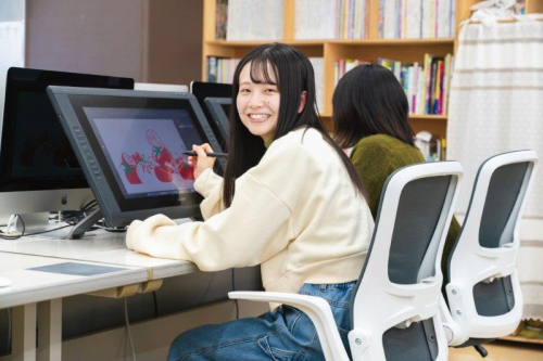 イラストも描けるデザイナーを目指します。Macを使って、広告やパンフレット、Webをデザイン。基本的なスキルを身につけ、実際の企業からの依頼を受けプロジェクトに関わりながら表現の仕方を学びます。