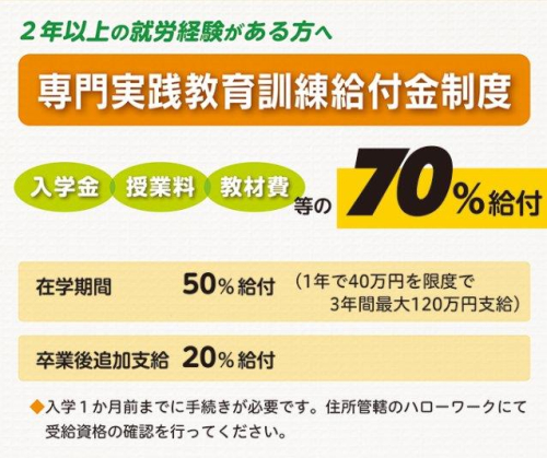 在職中または離職して1年以内の方や雇用保険に2年以上加入している方対象の、さまざまな技術を身につけて、就職や転職を目指す「学びなおし」支援制度