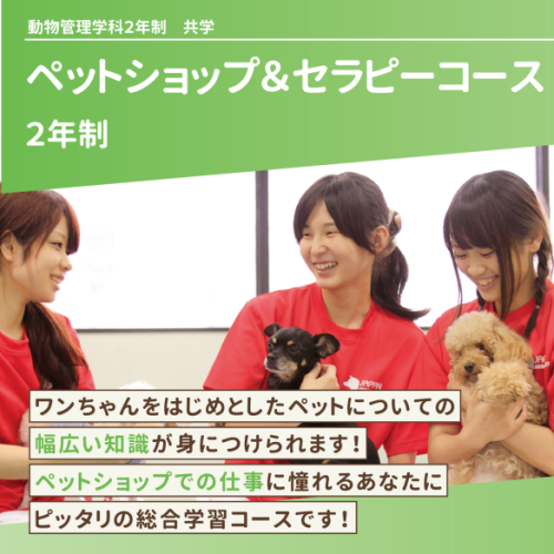 ペットは家族の一員であり、かけがえのない存在です。飼育環境もかなり向上してきており、ペットたちも長生きする時代になっています。今後、ペットに関するサービスは広がっていくことが予想され、ペットに関する知識と技術を有する人材が求められます。本コースでは、ペット業界で必要な知識や技術を身につけるとともに、実際に就職してから必要となるペットビジネスの知識や技術をバランス良く学んでいきます。また、動物たちのストレスを少しでも取り除き、たくさんの人々を癒すための犬の能力を最大限に発揮するセラピーを学びます。人にも動物にも優しくなるためにさまざまなことを総合的に学んでいくコースです。