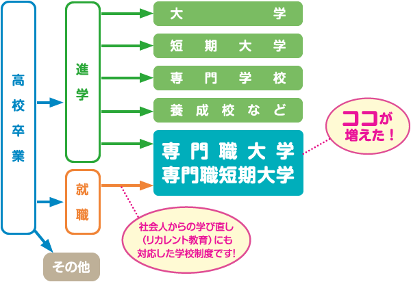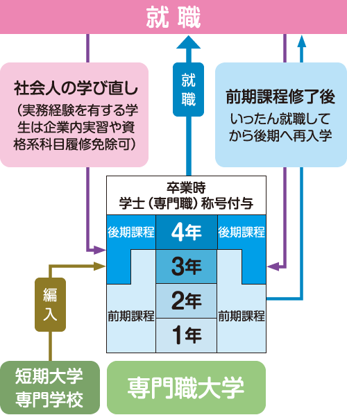 | 卒業後の称号・学位 | 学士(専門職)、短期大学士(専門職) | 学士 | 短期大学士 | 専門士(2年制以上で基準あり) 高度専門士(4年制以上で基準あり) |