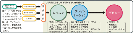 ミュージシャンや俳優等(以下タレント)としてのデビューもまた難関です。学校を卒業した後、スカウトされたりオーディションに合格したら即デビューというイメージを持っている人も多いと思いますが、スカウトやオーディションは野球で言えば甲子園に出るようなもので、それだけでプロ入りが保証されるわけではないのです。すぐにデビューできる人もいますが、それはごく一握り。タレントとしての基礎的な技術(演技力、歌唱力など)を身につけるためのレッスンを行い、その上でデビューのためのプレゼン等を行うというステップが待っています(次ページ上の表)。スクール等に通うのも一つの手。とにかく、何らかの形で技術を磨くこと。言い換えれば、努力こそが唯一にして最大の武器と言っても過言ではなく、頑張りが報われるやりがいのある仕事だという点も、憧れる人の多い理由の一つでしょう。