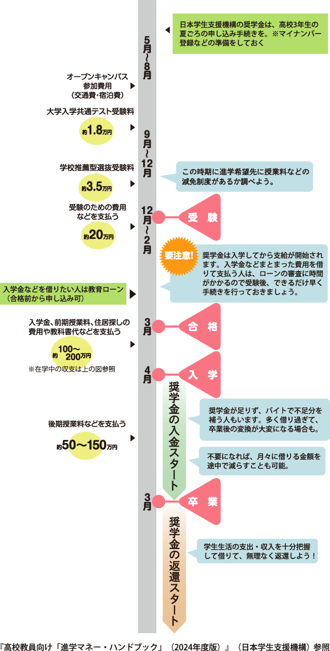 全国大学生活協同組合連合会がまとめた「2024年度保護者に聞く新入生調査」によりますと、受験から入学前までには、100万~200万円以上というまとまったお金が必要になります。国立大学進学か私立大学進学かで、学校納付金に大きな違いが出てきます。また自宅通学か自宅外通学かによって、住まい探しの費用などにも違いが出てきます。